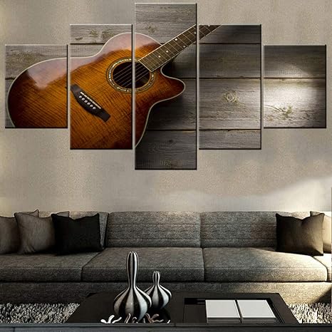 Amazon Com Tumovo Wall Art For Living Room Acoustic Guitar On Wood Desk Pictures Music Instrument Paintings 5 Panel Prints Artwork On Canvas Giclee Modern Home Decor Framed Stretched Ready To Hang 60 Wx32 H Posters